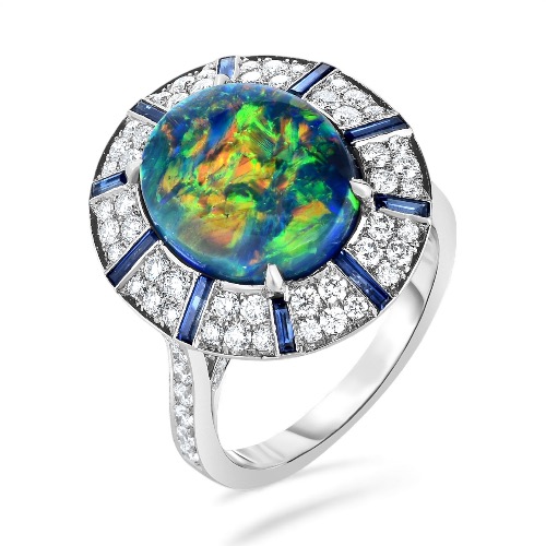 Center stone: Australian black opal, round cabochon.