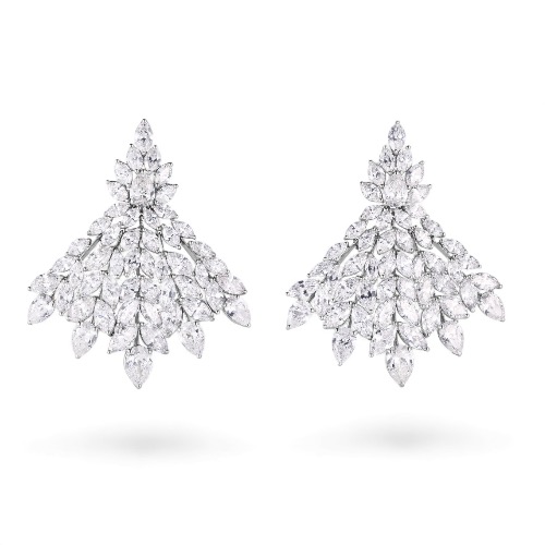 • White gold earrings featuring a three-dimensional fan design set with pear- and marquise-cut diamonds. Articulated structure for graceful movement, flawless finish, and striking visual presence.