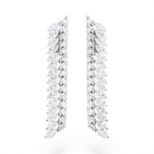 Long white-gold earrings featuring rows of diamonds in marquise and baguette cuts, creating an elegant, linear design with exceptional brilliance. The combination of elongated cuts enhances light dispersion, delivering a sophisticated, high-impact piece for those who seek true luxury.