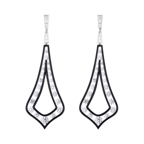 Elegant drop earrings featuring an openwork design in white gold framed with black enamel, set with round brilliant diamonds. The fluid, architectural silhouette enhances the light play of the stones, creating a refined, modern, and high-impact piece. Perfect for those who appreciate contemporary luxury.