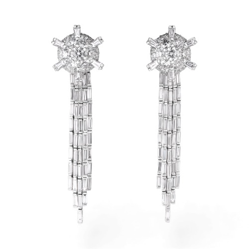 • Elegant earrings crafted in white metal, showcasing a central cluster of round brilliant-cut diamonds surrounded by baguette-cut diamonds arranged in a starburst pattern. Three vertical strands of meticulously set baguette diamonds create a fluid, elongated silhouette with exceptional sparkle and symmetry. Perfect for high-end occasions.