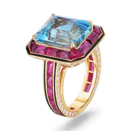 • A striking cocktail ring featuring a large sky-blue gemstone framed by vibrant pink stones and accented with sparkling diamonds. A bold, modern masterpiece with exceptional color contrast and elegance.