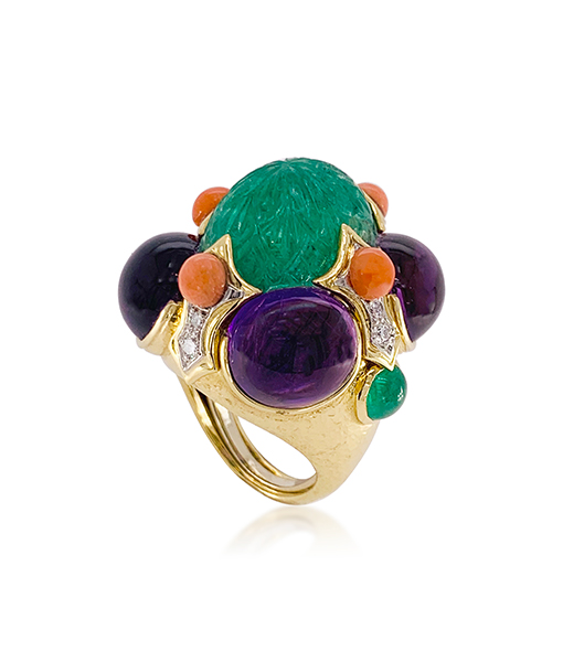 David Webb Emerald, Amethyst Coral Ring Diamonds