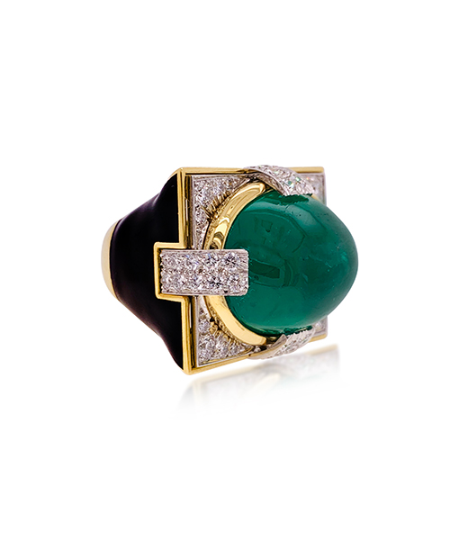 David Webb Grand Central Ring Cabochon Emerald Diamond Black Enamel