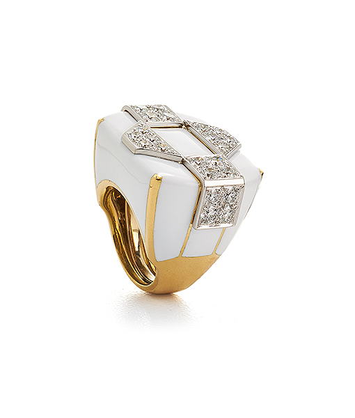 The David Webb Manhattan Minimalism Collection ring featuring brilliant-cut diamonds, and white enamel is also available in black enamel.