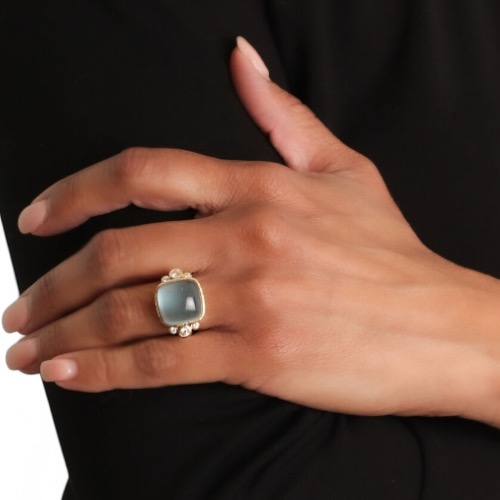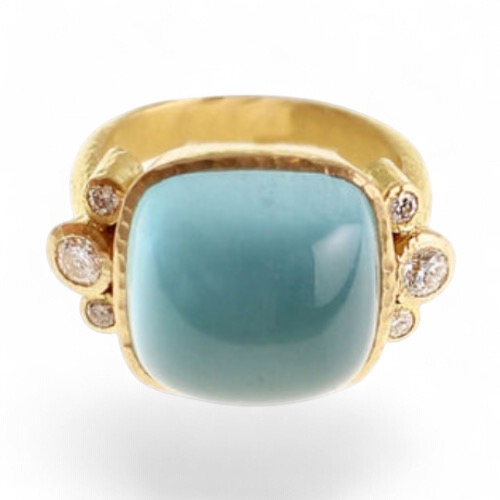 Cushion 14 x 14 mm cabochon aquamarine with side 3 mm diamonds flanked by 2 mm diamonds on thin shank. Small square cushion aquamarine and diamond ring. Approximate measurement including bezel 16 mm vertically by 23 mm across. Ring standard size is 6 1/2; there will be an additional charge for sizing over size 8. Can be sized as needed.