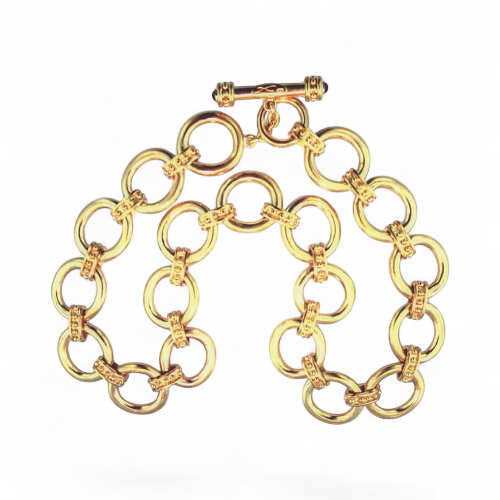 • Elba' link necklace (17"), large gold flat link necklace, approximately 17 inches in length by 20 mm wide, toggle and ring closure (blue sapphire or ruby cabochon stones in toggle ends).