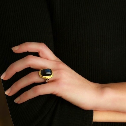 Cushion cut 13 x 18 mm labradorite with side blue sapphire triad and straight shank. Large vertical cushion labradorite and blue sapphire ring. Approximate measurement including bezel 22 mm vertically by 22 mm across. Ring standard size is 6 1/2; there will be an additional charge for sizing over size 8. Can be sized as needed.