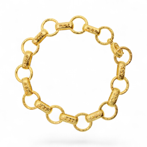 • 'Torcello' link bracelet with a circle clasp. Medium gold link bracelet. Approximately 7.5 inches in length by 11 mm wide. Clasp with safety.