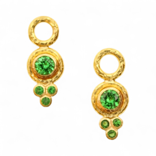Round 4.5 mm faceted tsavorite earring pendants for hoops with bottom 2 mm faceted tsavorite triad. Small round tsavorite earring pendants. Approximate measurement including bezel 20 mm vertically by 9 mm across. To be worn on hoops or 'Sarabella' earrings.