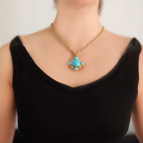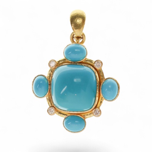 Cushion 19 mm Sleeping Beauty turquoise with four 2.7 mm diamonds and four 7 x 9 mm cushion Sleeping Beauty turquoise with gold dots on thin bezel and fold-down detachable bale. Large square cushion Sleeping Beauty turquoise and diamond brooch. Approximate overall size 36 mm vertically by 36 mm across. Can be worn as brooch or pendant, with fold-down detachable bale.