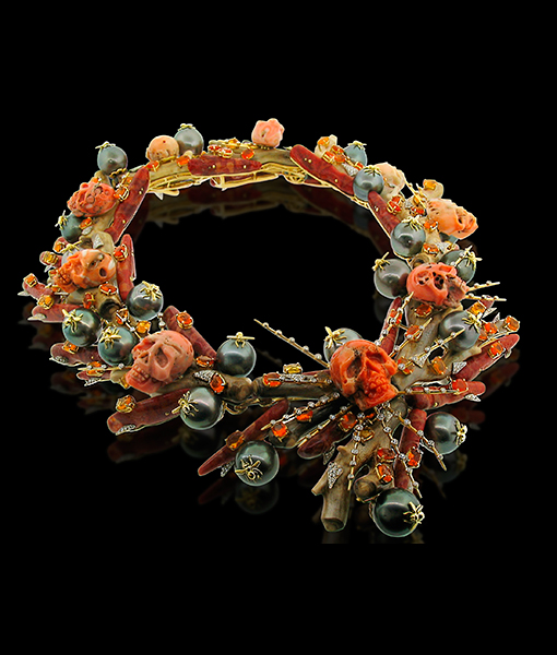 Duquette’s artistic and symbolic reminder of the inevitability of death in the form of a collar necklace set with Coral and Opals
